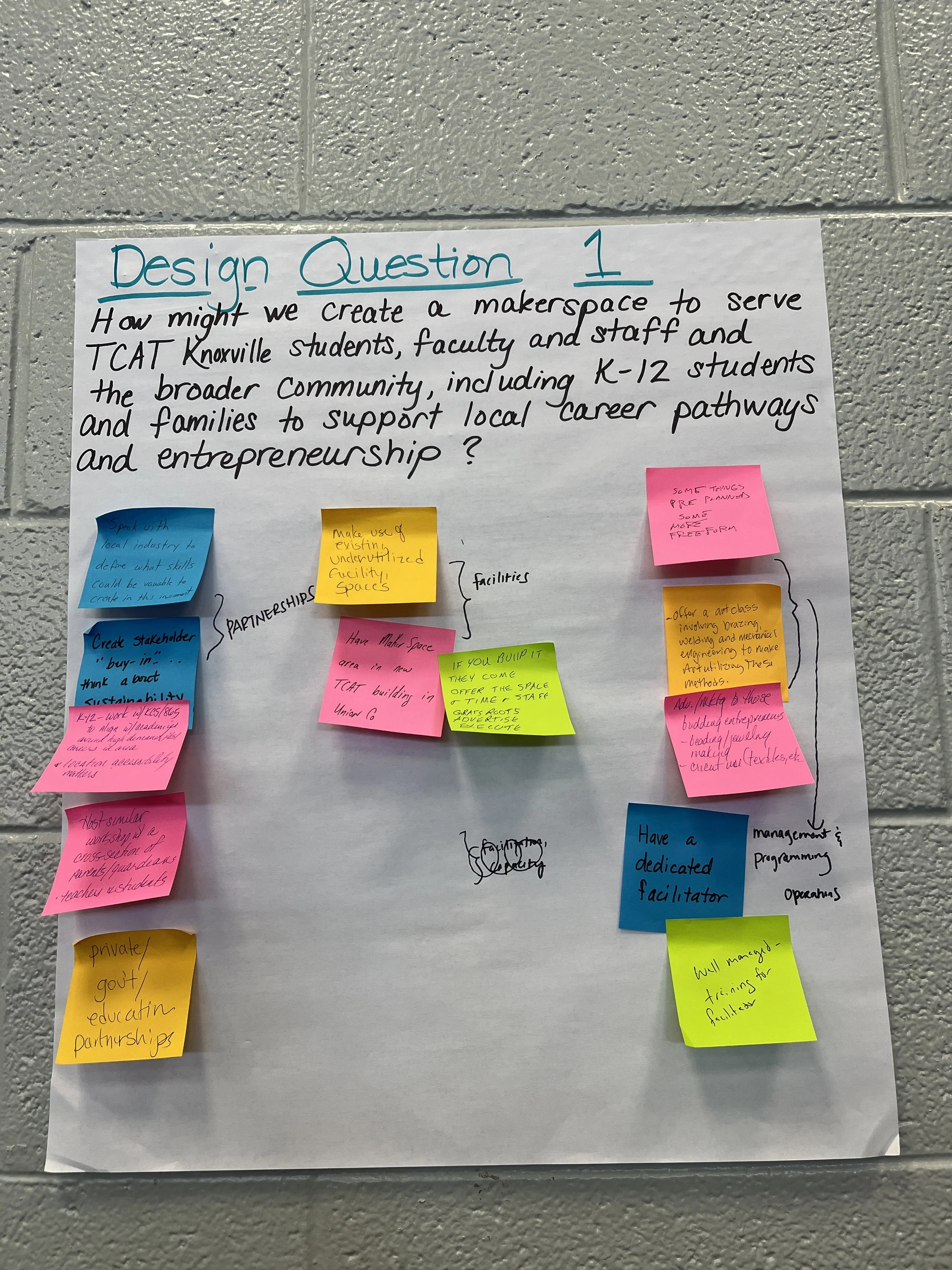 This workshop was focused on the key challenge of creating a makerspace to serve TCAT Knoxville students, faculty and staff and the broader community, including K-12 students and families to support local career pathways and foster entrepreneurship.